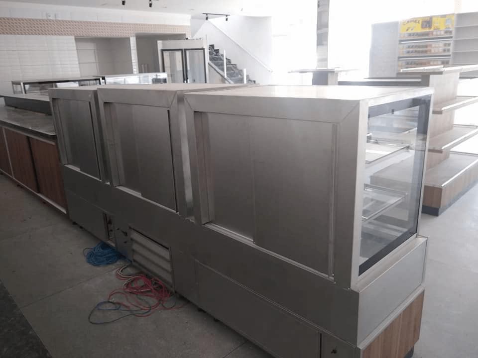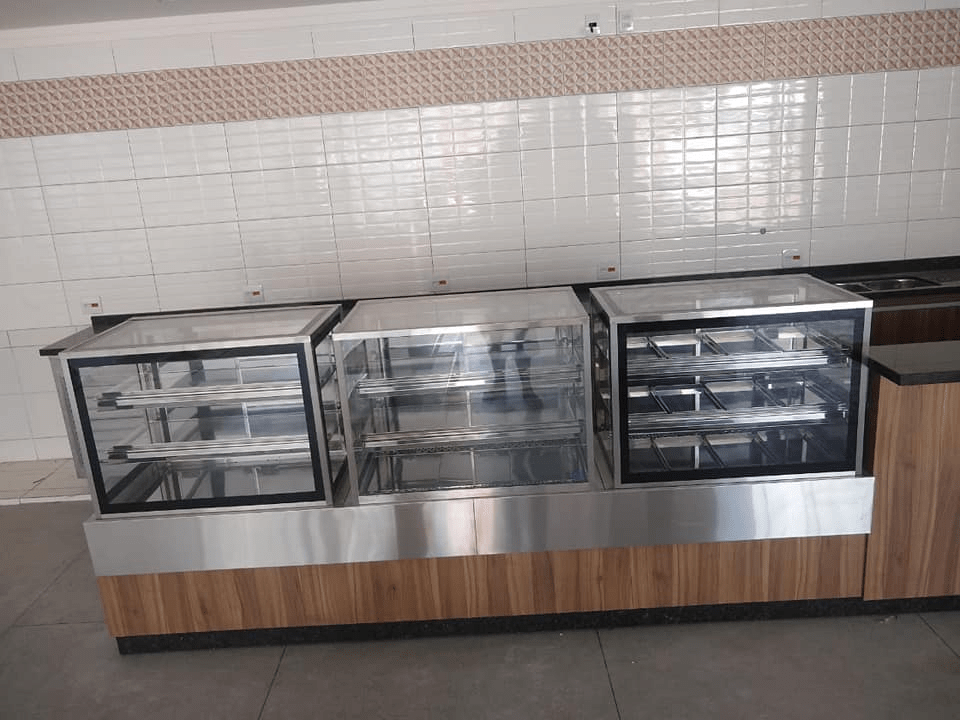 CONSTRUTIVO: Vidros frontais, laterais e superior em vidro duplo plano, Acesso posterior em portas de correr em aço inox com aplicação de espelho de 4mm, trilho em polietileno, de batoque de vidro 2×2 colado na UV, Bandeja perfurada removível em aço inox AISI 430 brilhante para circulação do ar refrigerado;